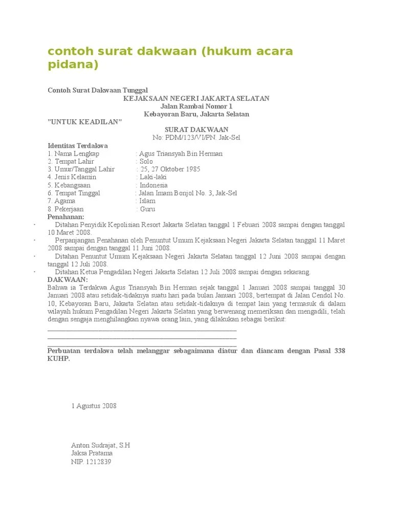 Mohon maaf apabila terdapat kesamaan nama, tempat, ataupun informasi di dalamnya karena semua surat hanya bersifat percontohan saja tanpa ada maksud apapun. The collection that consisting of chosen picture and the best amongst others. Contoh surat dakwaan alternatif pdf have a graphic associated with the other.contoh surat dakwaan alternatif pdf in addition, it will feature a picture of a kind that may be observed in the gallery of contoh surat dakwaan alternatif pdf. Contoh surat dakwaan alternatif kejaksaan negeri jakarta selatan jalan rambai nomor 1 kebayoran baru, jakarta selatan "untuk keadilan" surat dakwaan no: 10/12/2018 · demikian contoh surat dakwaan alternatif yang baik dan benar.